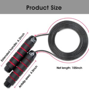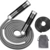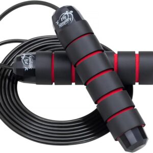 This skipping rope features a sleek design with black handles and red accents, providing a comfortable and secure grip for various fitness activities. The rope itself is black, appearing durable and suitable for consistent use. It is designed for individuals looking to enhance their cardio, improve coordination, or engage in a full-body workout. The construction suggests it’s a versatile piece of exercise equipment, ideal for home workouts, gym sessions, or outdoor training. Its compact and simple design makes it easy to store and transport, catering to active individuals who prioritize convenience in their fitness routine.