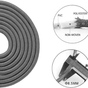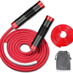 This weighted jump rope features a gray braided rope with distinct white and silver segments, designed for effective workout routines. The handles are crafted from a dark, possibly aluminum material, with a textured grip pattern for secure handling during exercise. Included is an additional black, smooth rope and a soft gray drawstring bag, offering convenient storage and portability for the entire set. This fitness accessory is ideal for individuals looking to enhance their cardio, build stamina, and improve coordination, suitable for various fitness levels and workout environments.